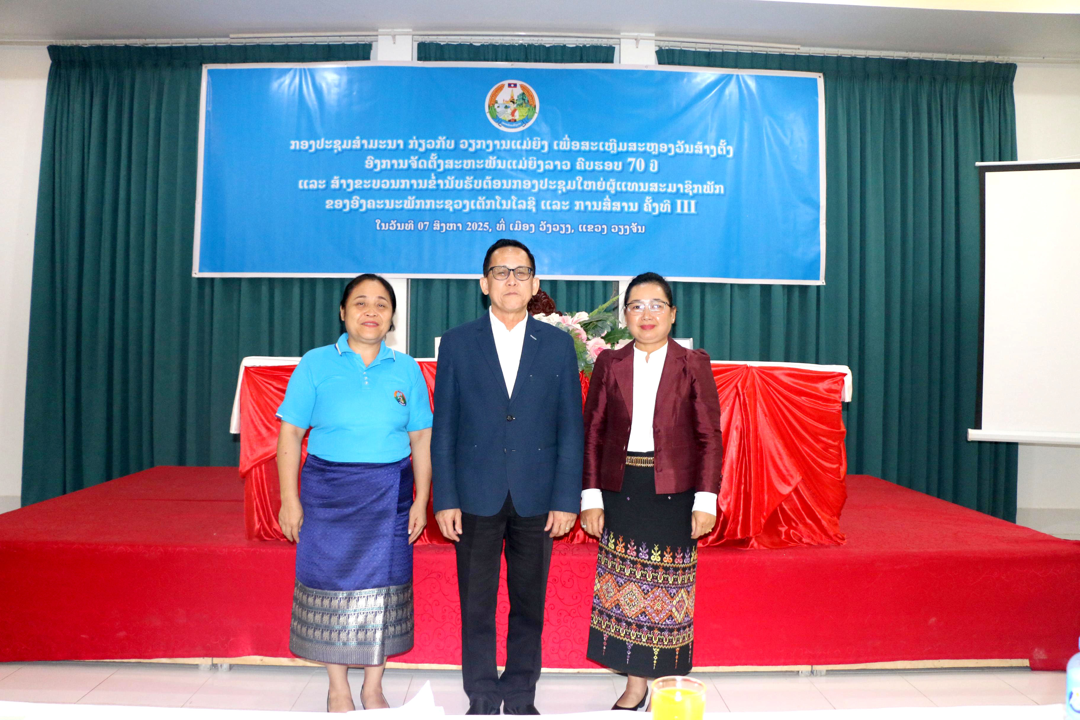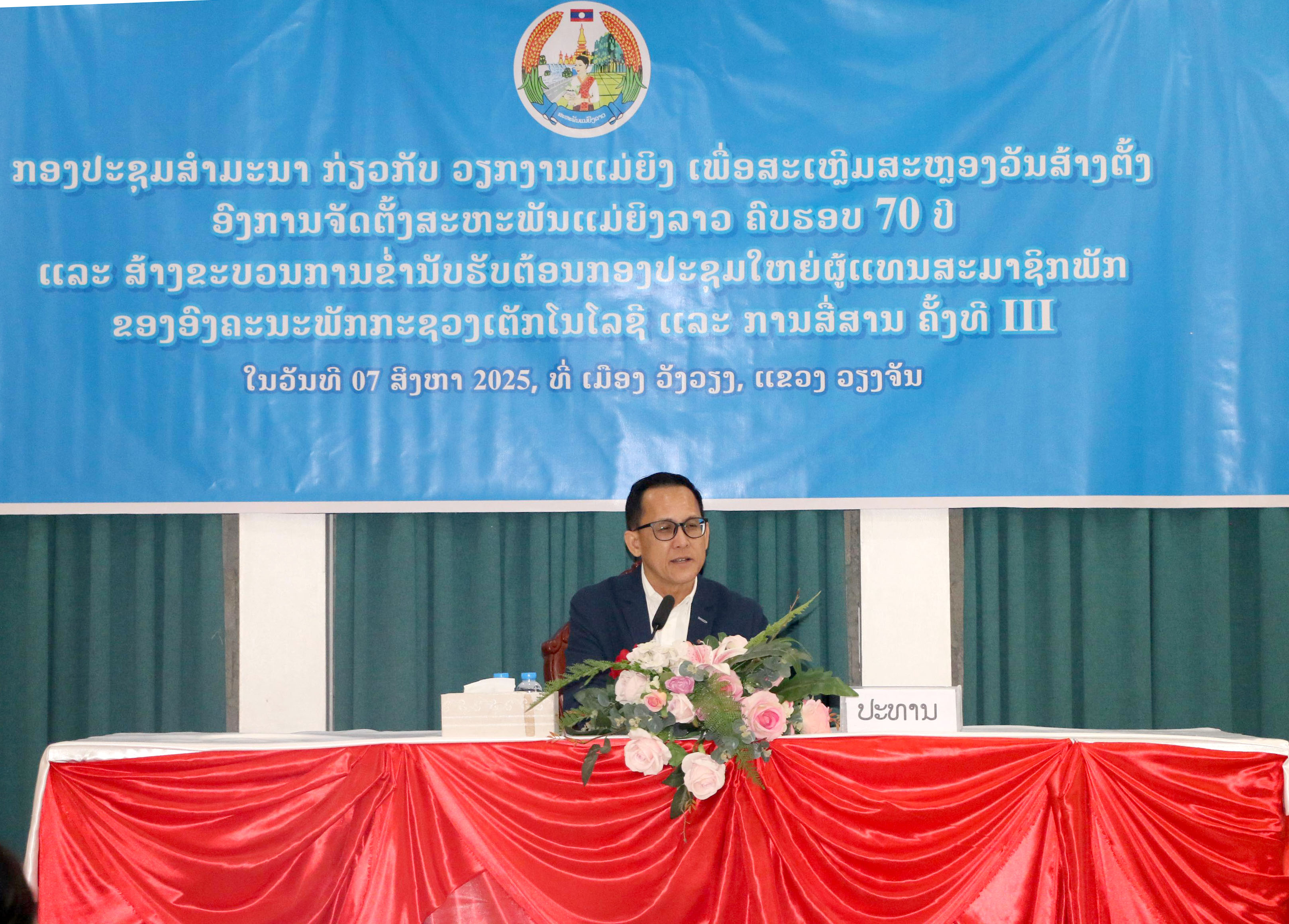 ວັນທີ 07 ສິງຫາ 2025 ຜ່ານມາ, ສະຫະພັນແມ່ຍິງ ກະຊວງເຕັກໂນໂລຊີ ແລະ ການສື່ສານ (ກຕສ) ໄດ້ຈັດກອງປະຊຸມສຳມະນາແລກປ່ຽນ ແລະ ຖອດຖອນບົດຮຽນ ວຽກງານແມ່ຍິງໃນການຫັນເປັນດິຈິຕອນຂຶ້ນ, ທີ່ເມືອງວັງວຽງ, ແຂວງ ວຽງຈັນ. ໂດຍການເປັນປະທານຂອງ ສະຫາຍ ປະລິນຍາເອກ ສັນຕິສຸກ ສິມມາລາວົງ, ຮອງເລຂາຄະນະບໍລິຫານງານພັກກະຊວງ, ຜູ້ຊີ້ນຳວຽກງານອົງການຈັດຕັ້ງມະຫາຊົນ, ຮອງລັດຖະມົນຕີ ກະຊວງເຕັກໂນໂລຊີ ແລະ ການສື່ສານ, ມີສະຫາຍປະທານສະຫະພັນແມ່ຍິງ, ບັນດາຄະນະບໍລິຫານງານສະຫະພັນແມ່ຍິງກະຊວງ, ຕາງໜ້າເອື້ອຍນ້ອງແມ່ຍິງຈາກສະຫະພັນແມ່ຍິງຮາກຖານ ແລະ ໜ່ວຍສະຫະພັນແມ່ຍິງ ອ້ອມຂ້າງກະຊວງ ເຂົ້າຮ່ວມ ຈຳນວນ 100 ກວ່າສະຫາຍ.