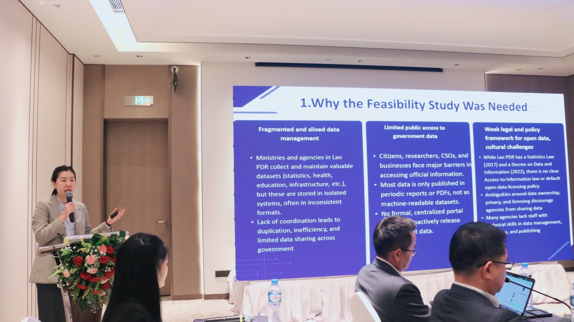 ຈຸດປະສົງຂອງກອງປະຊຸມຄັ້ງນີ້, ກໍເພື່ອເຜີຍແຜ່ຜົນການສຶກສາຄວາມເປັນໄປໄດ້ (Feasibility Study) ໃນການຈັດຕັ້ງປະຕິບັດໂຄງການພັດທະນາລະບົບປະຕູຂໍ້ມູນເປີດພາກລັດ ຂອງ ສປປ ລາວ, ເຊິ່ງໄດ້ເປັນກົນໄກທີ່ສໍາຄັນໃນການສົ່ງເສີມ ການແບ່ງປັນຂໍ້ມູນທີສາມາດເປີດເຜີຍ ແລະ ໜ້າເຊື່ອຖື ແລະ ການອໍານວຍຄວາມສະດວກຂອງຂໍ້ມູນຈາກພາກລັດ, ການສົ່ງເສີມນະວັດຕະກໍາການນໍາໃຊ້ຂໍ້ມູນ ເພື່ອການພັດທະນາຕໍ່ຍອດດ້ານການວິໄຈ ແລະ ສົ່ງເສີມພາກທຸລະກິດ, ເພີ່ມການມີສ່ວນຮ່ວມຂອງປະຊາຊົນ ໃນຂະບວນຂັບເຄື່ອນ ແລະ ພັດທະນາ ການຫັນດິຈິຕອນທາງດ້ານຂໍ້ມູນ ຂອງ ສປປ ລາວ. ໂຄງການດັ່ງກ່າວ ໄດ້ຮັບການສະໜັບສະໜູນໂດຍ ອົງການອາຊີປາຊິຟິກ ໂທລະຄົມມະນາຄົມ ແລະ ກອງທຶນພັດທະນາ ສ.ເກົາຫຼີ (APT-EBC-K) ແລະ ໄດ້ດໍາເນີນເປັນເວລາ 6 ເດືອນ ປະກອບມີ: 1. ການສືກສາຄວາມເປັນໄປໄດ້ສະພາບຄວາມພ້ອມຂອງ ສປປ ລາວ; 2. ການອອກແບບເວັບໄຊ ປະຕູຂໍ້ມູນ; 3. ການແລກປ່ຽນບົດຮຽນ ແລະ ທັດສະນະສຶກສາທີ ສ.ເກົາຫຼີ; ແລະ 4. ການຈັດສໍາມະນາປຶກສາຫາລື ແລະ ແລກປ່ຽນຄວາມຄິດເຫັນລະຫວ່າງຫ້ອງການພາກລັດ.
