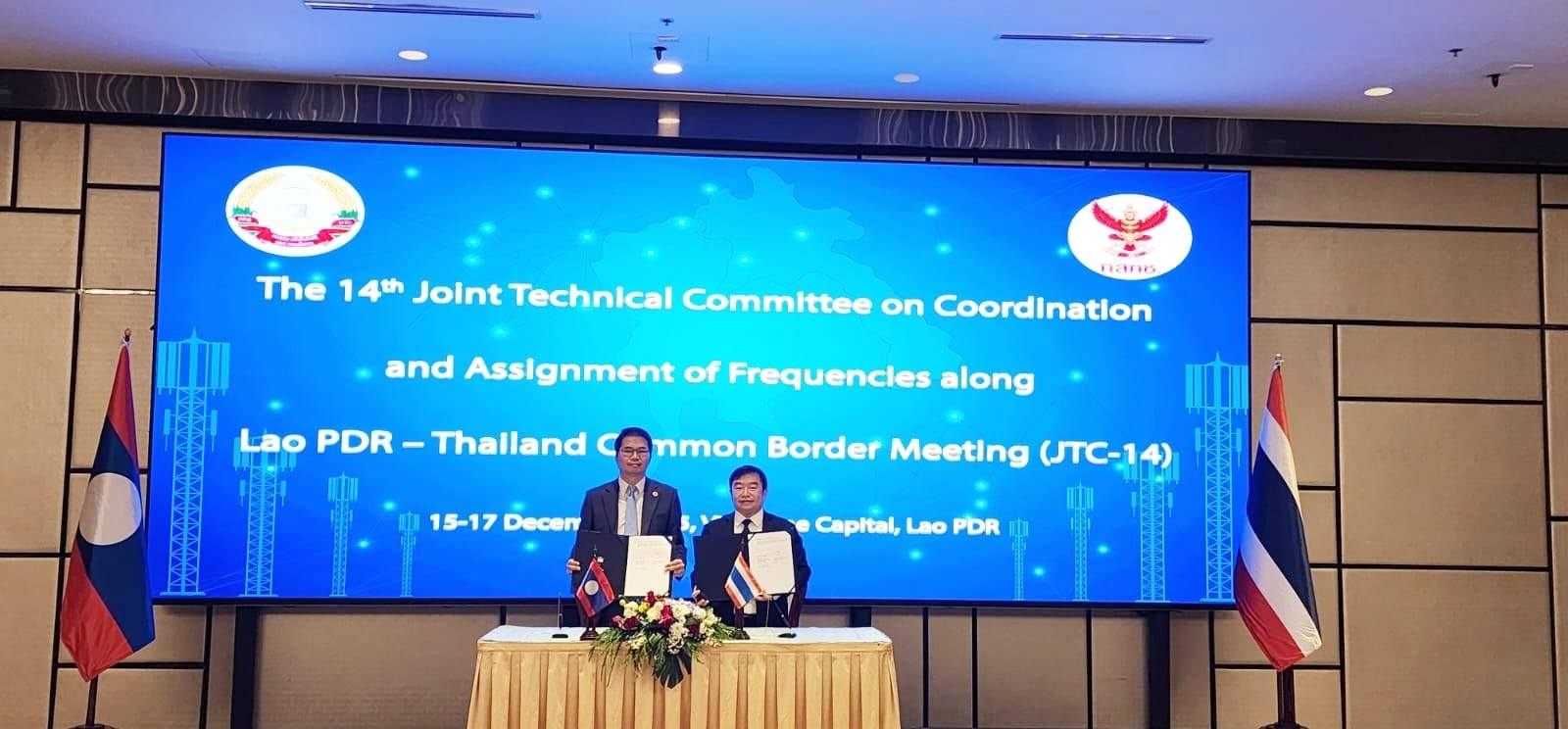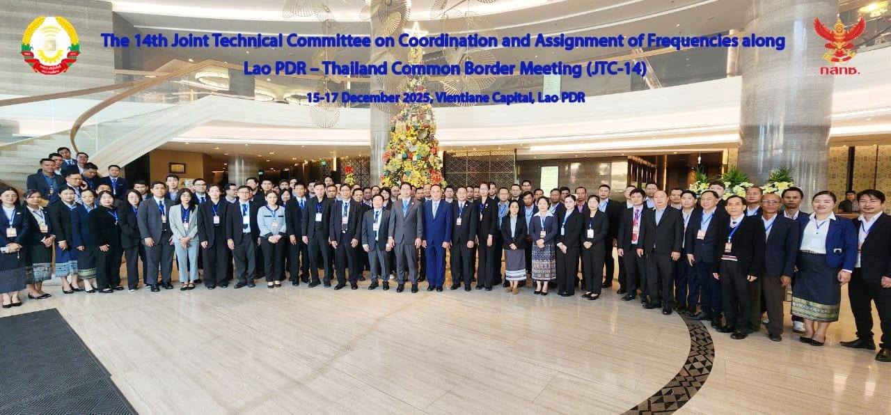 ໃນລະຫວ່າງວັນທີ 15-17 ທັນວາ 2025, ກົມຄື້ນຄວາມຖີ່ວິທະຍຸສື່ສານ, ກະຊຊວງເຕັກໂນໂລຊີ ແລະ ການສື່ສານ (ກຕສ) ໄດ້ເປັນເຈົ້າພາບຈັດກອງປະຊຸມ ຄະນະກຳມະການຮ່ວມມືດ້ານວິຊາການ ແລະ ປະສານງານ ຄື້ນຄວາມຖີ່ ລຽບຕາມຊາຍແດນ ລາວ-ໄທ ຄັ້ງທີ 14, ຢູ່ທີ່ໂຮງແຮມຄຣາວພາຊ່າ, ນະຄອນຫຼວງວຽງຈັນ. ກອງປະຊຸມຄັ້ງນີ້, ຕາງໜ້າຄະນະຝ່າຍລາວ ນຳໂດຍ ທ່ານ ມອນສິລິ ດວງມະນີ ຮອງຫົວໜ້າກົມຄື້ນຄວາມຖີ່ວິທະຍຸສື່ສານ, ກະຊວງ ເຕັກໂນໂລຊີ ແລະ ການສື່ສານ ແລະ ສຳນັກງານກິດຈະການກະຈາຍສຽງ, ກິດຈະການ ໂທລະພາບ ແລະ ກິດຈະການໂທລະຄົມມະນາຄົມ ແຫ່ງປະເທດໄທ ນຳໂດຍ ທ່ານ ສະເໜ່ ສາຍວົງ, ຜູ້ຊ່ຽວຊານ ພິເສດສໍານັກບໍລິຫານຄື້ນຄວາມຖີ່, ສຳນັກງານກິດຈະການກະຈາຍສຽງ, ກິດຈະການໂທລະທັດ ແລະ ກິດຈະການ ໂທລະຄົມມະນາຄົມ ແຫ່ງປະເທດໄທ ມີພາກສ່ວນທີ່ກ່ຽວຂ້ອງເຂົ້າຮ່ວມຄື: ຂະແໜງການເຕັກໂນໂລຊີ ແລະ ການສື່ສານ, ຂະແໜງການ ວິທະຍຸກະຈາຍສຽງ ແລະ ໂທລະພາບ, ຂະແໜງການສື່ສານທາງການບິນ ແລະ ບັນດາບໍລິສັດຜູ້ໃຫ້ບໍລິການດ້ານໂທລະຄົມມະນາຄົມ ຂອງທັງ 2 ປະເທດ ເຂົ້າຮ່ວມທັງໝົດ ຈຳນວນ 100 ທ່ານ.