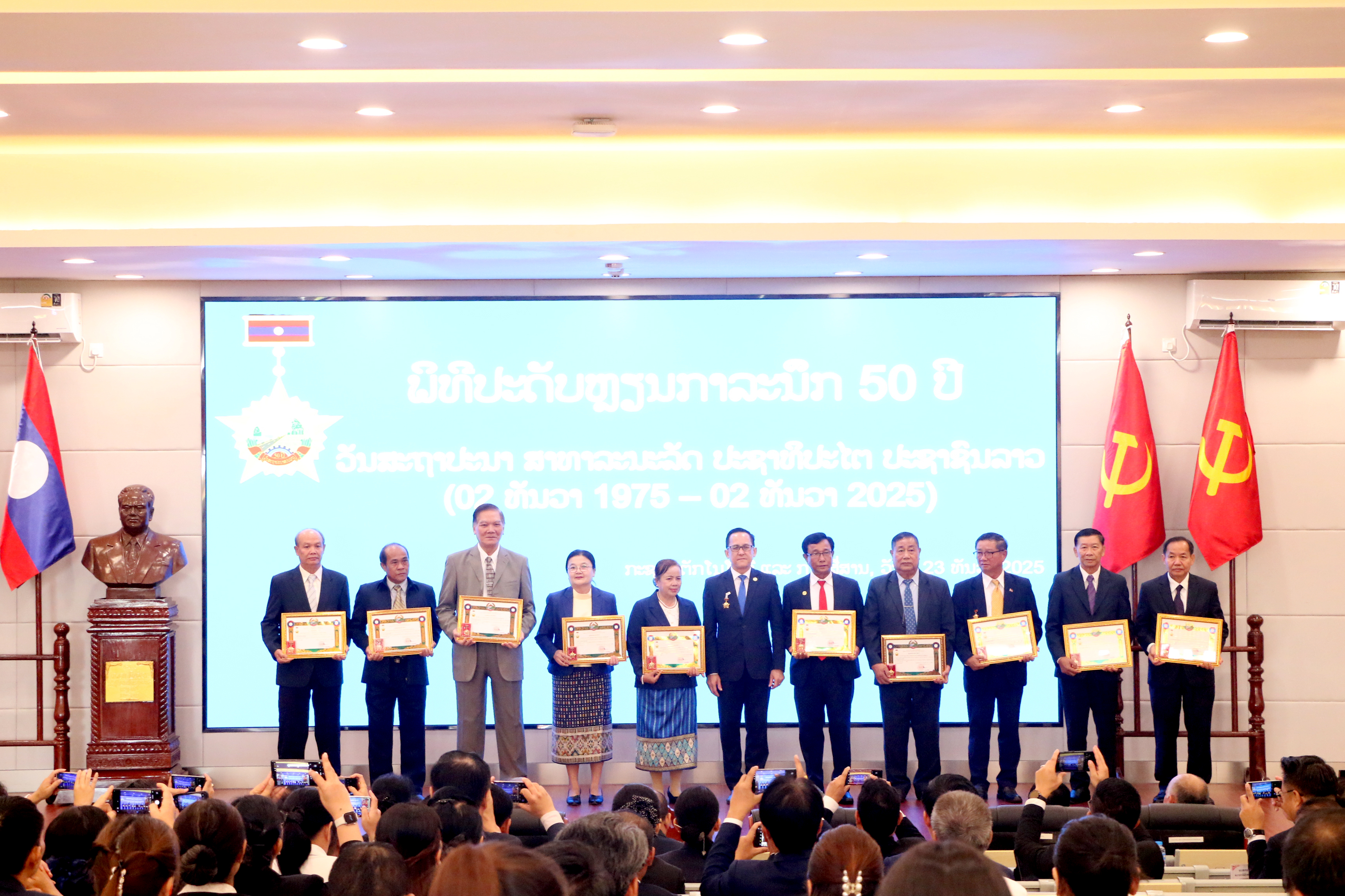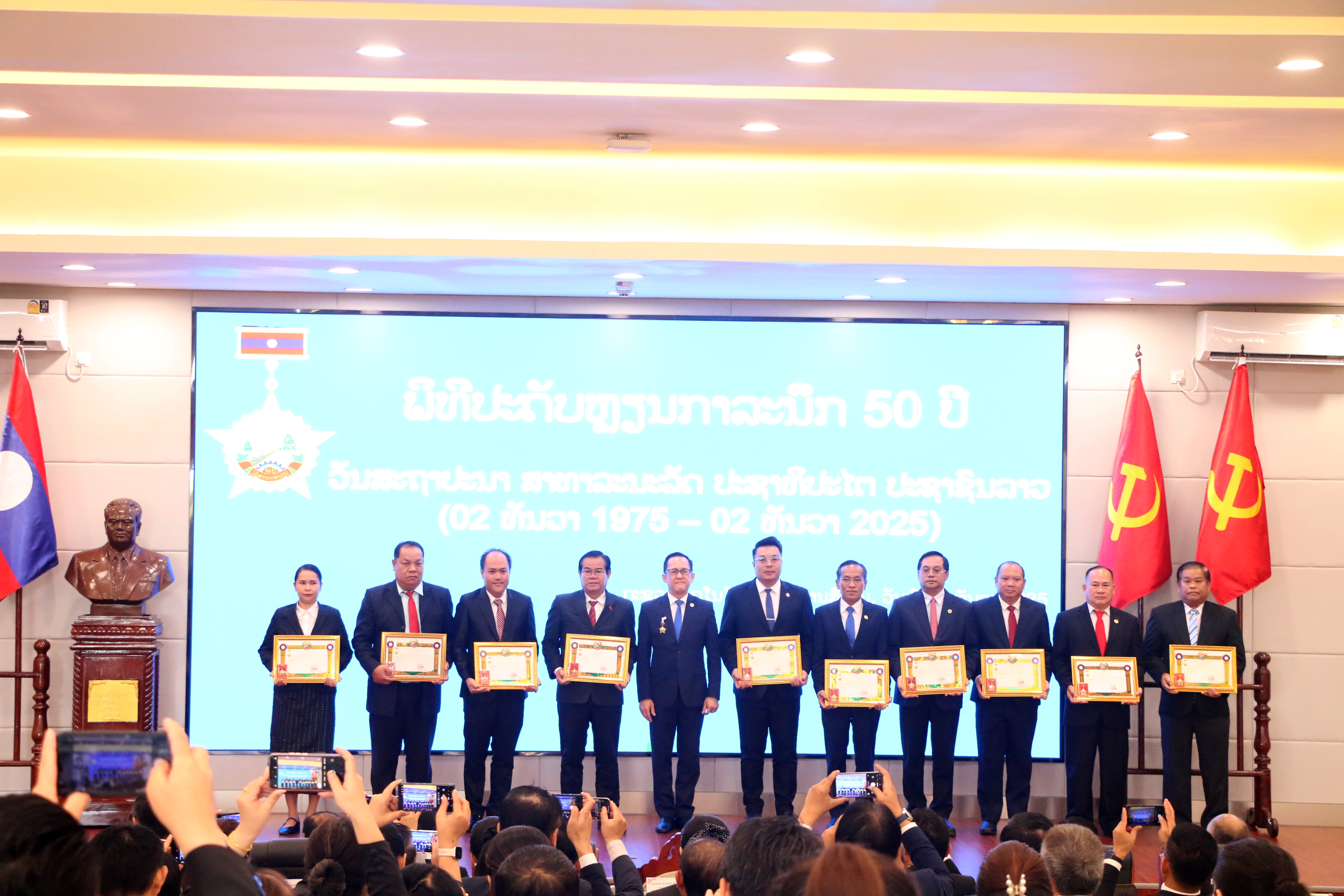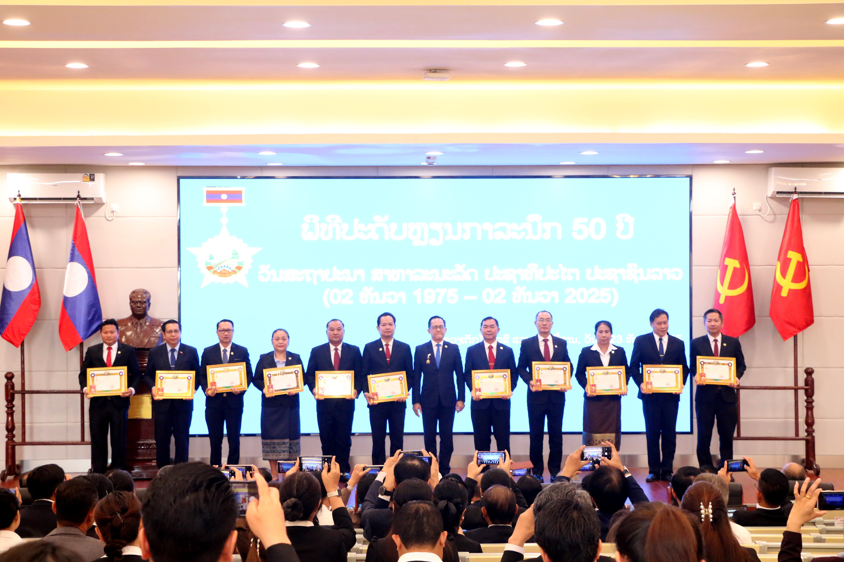 ໃນໂອກາດດຽວກັນນີ້, ພະນະທ່ານ ສົມສະຫວາດ ເລັ່ງສະຫວັດ ອະດີດກຳມະການກົມການເມືອງສູນກາງພັກ, ອະດີດຮອງນາຍົກລັດຖະມົນຕີ ແຫ່ງ ສປປ ລາວ ໄດ້ໃຫ້ກຽດຂຶ້ນ ປາຖະກະຖາ ວັນສະຖາປະນາ ສປປ ລາວ ຄົບຮອບ 50 ປີ (02/12/1945 – 02/12/2025) ແລະ ວັນເກີດ ປະທານໄກສອນ ພົມວິຫານ ຄົບຮອບ 105 ປີ (13/12/1920 – 13/12/2025) ເພື່ອເຮັດໃຫ້ ພະນັກງານ-ລັດຖະກອນ ທົ່ວຂະແໜງການ ເຕັກໂນໂລຊີ ແລະ ການສື່ສານ ໄດ້ຫວນຄືນມູນເຊື້ອ ແຫ່ງການຕໍ່ສູ້ອັນພິລະອາດຫານ ແລະ ໄຊຊະນະອັນຍິ່ງໃຫຍ່ ໃນການສະຖາປະນາ ສປປ ລາວ ຄົບຮອບ 50 ປີ, ສະແດງຄວາມກະຕັນຍູຮູ້ບຸນຄຸນ ອັນລົ້ນເຫຼືອຕໍ່ ປະທານ ໄກສອນ ພົມວິຫານ ຜູ້ນຳທີ່ແສນເຄົາລົບຮັກ, ຜູ້ນຳທີ່ມີຄວາມສະຫຼາດສ່ອງໃສ ແລະ ນຳເອົາຄຸນສົມບັດສິນທຳປະຕິວັດ ແລະ ແນວຄິດແຫ່ງການປ່ຽນແປງໃໝ່ຢ່າງມີຫຼັກການ ຂອງປະທານ ໄກສອນ ພົມວິຫານ ມາເປັນເຂັມທິດຊີ້ທາງໃນການພັດທະນາວຽກງານເຕັກໂນໂລຊີ ແລະ ການສື່ສານ ເພື່ອການຫັນເປັນດີຈີຕອນຂອງປະເທດຊາດ, ເພື່ອສຶກສາອົບຮົມໃຫ້ພະນັກງານ, ສະມາຊິກພັກທົ່ວຂະ