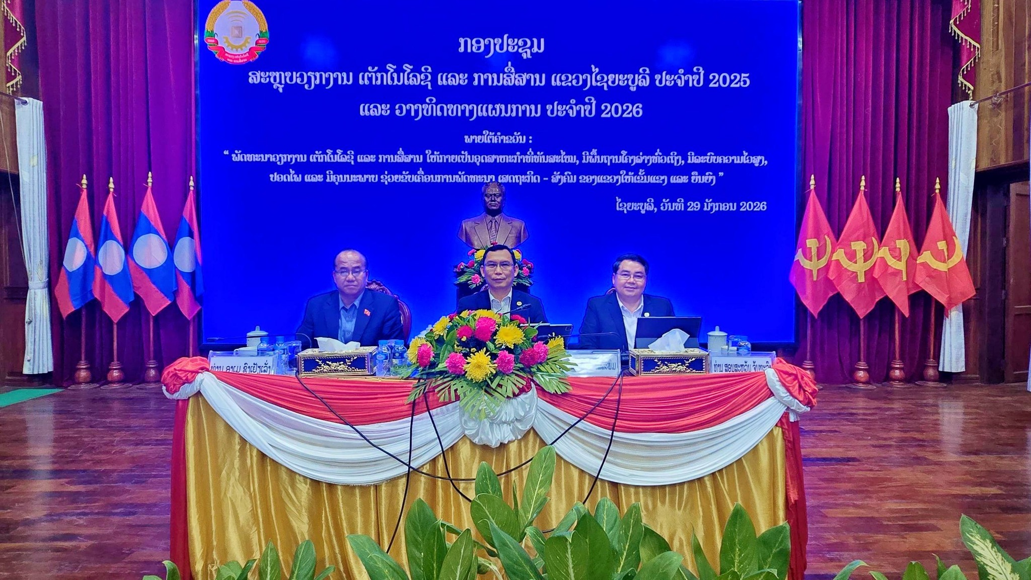 ໃນຕອນເຊົ້າຂອງວັນທີ 29 ມັງກອນ 2026, ທີ່ຫ້ອງວ່າການປົກຄອງ ແຂວງ ໄຊຍະບູລີ ໄດ້ມີພິທີເປີດກອງປະຊຸມສະຫຼຸບການຈັດຕັ້ງປະຕິບັດວຽກງານເຕັກໂນໂລຊີ ແລະ ການສື່ສານ ແຂວງ ໄຊຍະບູລີ ປະຈໍາປີ 2025, ທິດທາງແຜນການ ປະຈໍາປີ 2026 ແລະ ແຜນພັດທະນາວຽກງານເຕັກໂນໂລຊີ ແລະ ການສື່ສານ 5 ປີ (2026-2030) ຂອງ ແຂວງ ພາຍໃຕ້ຄໍາຂວັນ: “ ພັດທະນາວຽກງານເຕັກໂນໂລຊີ ແລະ ການສື່ສານ ໃຫ້ກາຍເປັນອຸດສາຫະກຳທີ່ທັນສະໄໝ, ມີພື້ນຖານໂຄງລ່າງທົ່ວເຖິງ, ມີລະບົບຄວາມໄວສູງ, ປອດໄພ ແລະ ມີຄຸນນະພາບ ຊ່ວຍຂັບເຄື່ອນ ພັດທະນາເສດຖະກິດ-ສັງຄົມ ຂອງແຂວງ ໃຫ້ເຂັ້ມແຂວງ ແລະ ຢືນຢົງ”. ໃຫ້ກຽດເຂົ້າຮ່ວມເປັນຄະນະປະທານໂດຍ ທ່ານ ແກ້ວວີສຸກ ໂສລະພົມ, ຮອງລັດຖະມົນຕີ ກະຊວງເຕັກໂນໂລຊີ ແລະ ການສື່ສານ, ທ່ານ ອາເມ ຊົງເຢ້ຽເລັ່ງ, ຮອງປະທານຄະນະກຳມະການປົກຄອງແຂວງ ແລະ ທ່ານ ສອນສະຫວັນ ຈັນທະວົງ, ຫົວໜ້າພະແນກເຕັກໂນໂລຊີ ແລະ ການສື່ສານ ແຂວງ ໄຊຍະບູລີ, ຊຶ່ງມີບັນດາທ່ານຫົວໜ້າ, ຮອງຫົວໜ້າກົມ/ສູນ ຈາກກະຊວງເຕັກໂນໂລຊີ ແລະ ການສື່ສານ, ມີຫົວໜ້າ, ຮອງຫົວໜ້າພະແນກການ, ຄະນະກຳມະການປົກຄອງເມືອງ 11 ເມືອງ, ຜູ້ອໍານວຍການບໍລິສັດ ລັດວິສາຫະກິດ, ຫົວໜ້າ, ຮອງຫົວໜ້າຫ້ອງການເຕັກໂນໂລຊີ ແລະ ການສື່ສານ ເມືອງ, ຜູ້ປະສານງານປະຈຳເມືອງ ພ້ອມດ້ວຍພະນັກງານທີ່ກ່ຽວຂ້ອງເຂົ້າຮ່ວມ.