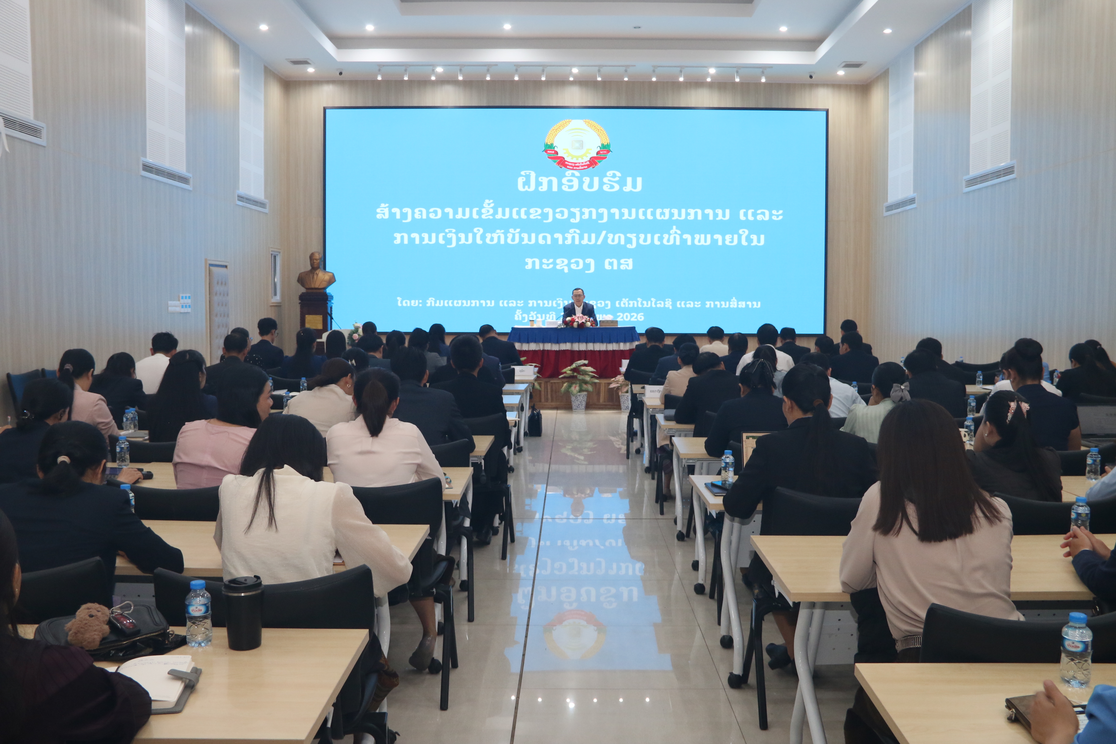 ກົມແຜນການ ແລະ ການເງິນ, ກະຊວງເຕັກໂນໂລຊີ ແລະ ການສື່ສານ (ກຕສ) ໄດ້ຈັດຝຶກອົບຮົມສ້າງຄວາມເຂັ້ມແຂງວຽກງານແຜນການ ແລະ ການເງິນ ໃຫ້ບັນດາກົມ/ທຽບເທົ່າ ພາຍໃນກະຊວງເຕັກໂນໂລຊີ ແລະ ການສື່ສານ, ໃນວັນທີ 26 ກຸມພາ 2026, ທີ່ຫ້ອງປະຊຸມສູນອິນເຕີເນັດແຫ່ງຊາດ. ໂດຍການເປັນປະທານຂອງ ທ່ານ ແກ້ວວີສຸກ ໂສລະພົມ ຮອງລັດຖະມົນຕີ ກຕສ ມີບັນດາທ່ານຫົວໜ້າກົມ, ສູນ, ສະຖາບັນ, ອົງການ, ຫົວໜ້າພະແນກ, ຮອງພະແນກ ແລະ ພະນັກງານ-ວິຊາການພາຍໃນກະຊວງ ເຂົ້າຮ່ວມຈຳນວນ 110 ທ່ານ.