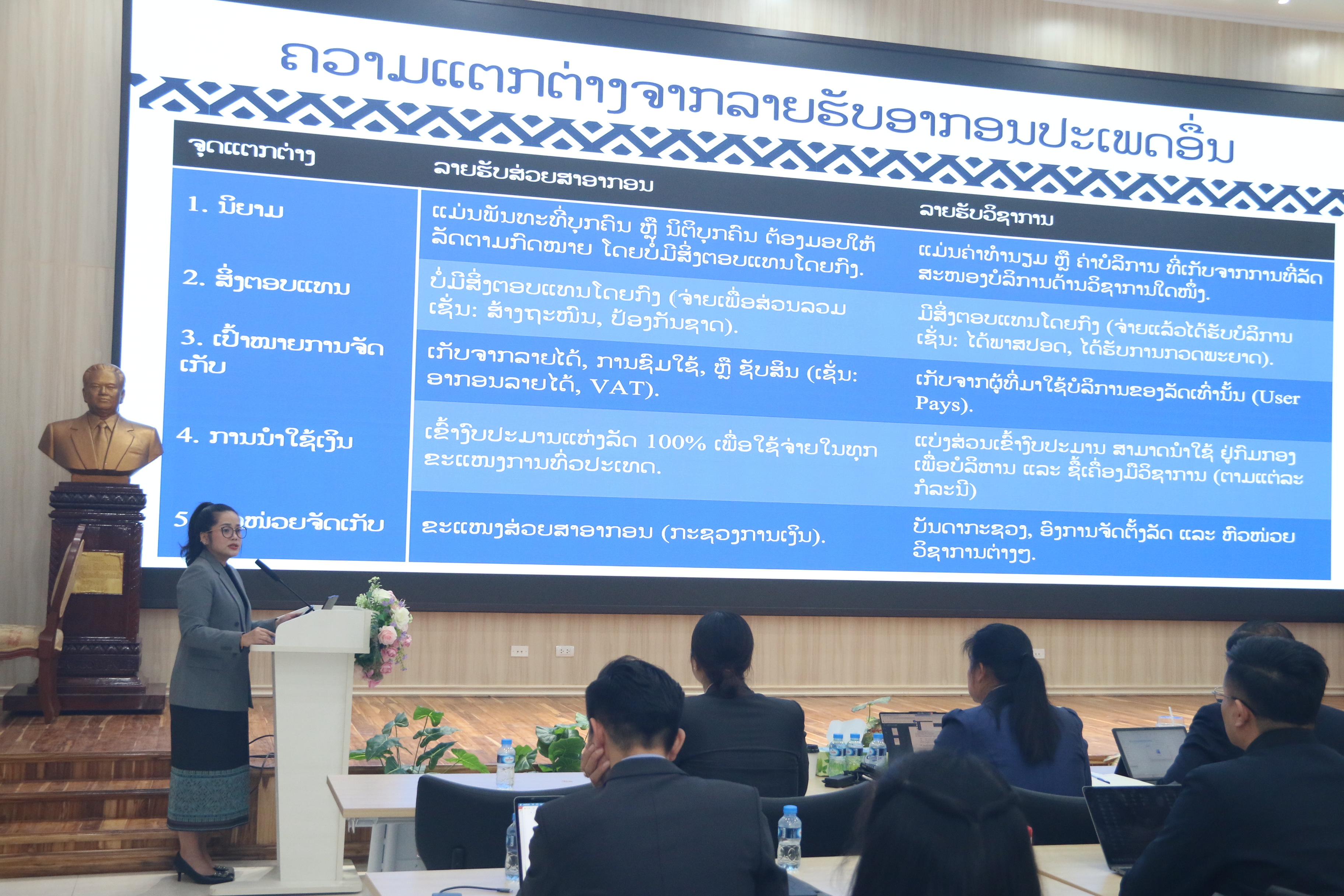 ການຈັດກອງປະຊຸມຝຶກອົບຮົມຄັ້ງນີ້, ກໍເພື່ອໃຫ້ຮຽນຮູ້, ເຂົ້າໃຈ ໃນວຽກງານປະເມີນຜົນໂຄງການລົງທຶນຂອງລັດ, ການນຳເດີນຂັ້ນຕອນ, ລະບຽບການຂອງການຈັດຊື້-ຈັດຈ້າງໃນໂຄງການລົງທຶນ ແລະ ລະບຽບການເກັບລາຍຮັບເຂົ້າງົບປະມານຂອງລັດ. ກອງປະຊຸມຝຶກອົບຮົມກໍດຳເນີນໂດຍນັກວິທະຍາກອນຈາກກົມປະເມີນຜົນ ແລະ ຈັດຊື້ຈັດຈ້າງ, ກົມສວຍສາອາກອນ, ກະຊວງການເງິນ. ໂດຍມີຫົວຂໍ້ທີ່ສໍາຄັນໃນການນຳສະເໜີຫຼາຍຫົວຂໍ້ ຄື: ວຽກງານຈັດຊື້-ຈັດຈ້າງ ແລະ ເຜີຍແຜ່ແຈ້ງການນຳໃຊ້ເວັບໄຊຈັດຊື້ຈັດຈ້າງ, ວຽກງານການຄຸ້ມຄອງລາຍຮັບວິຊາການ ແລະ ວຽກງານປະເມີນໂຄງການລົງທຶນຂອງລັດ, ຂັ້ນຕອນການດຳເນີນການປະເມີນໂຄງການ, ຂັ້ນຕອນການຈັດຊື້-ຈັດຈ້າງໃນບັນດາໂຄງການລົງທຶນຂອງລັດ ໃຫ້ຖືກຕ້ອງຕາມລະບຽບ, ແນະນຳນິຕິກຳ, ເອກະສານກ່ຽວຂ້ອງເພື່ອເປັນບ່ອນອີງໃນການປະຕິບັດວຽກງານໃນຕໍ່ໜ້າ. ພ້ອມນັ້ນ, ນັກສຳມະນາກອນ ໄດ້ມີການແລກປ່ຽນບົດຮຽນ ແລະ ປະກອບຄວາມຄິດເຫັນຢ່າງຟົດຟື້ນ.