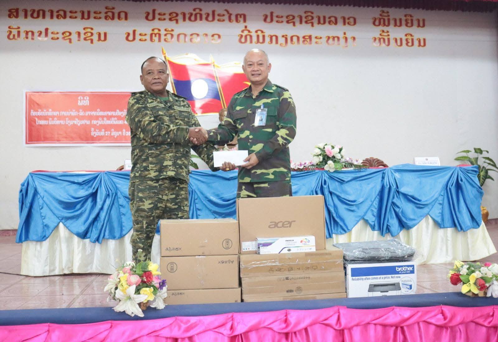 ພ້ອມນີ້, ຄະນະນັກສຶກສາການນຳພັກ-ລັດ ຍັງໄດ້ນຳເອົາຄອມຕັ້ງໂຕະ ຈຳນວນ 3 ເຄື່ອງ, ໂນດບຸກ 2 ເຄື່ອງ, ປິນເຕີ້ 1 ຊຸດ, ເງິນສົດ 5.000.000 ລ້ານກີບ. ລວມມູນຄ່າທັງໝົດ: 40 ລ້ານກີບ. ເພື່ອປະກອບສ່ວນຊຸກຍູ້ເຂົ້າໃນວຽກງານລວມຂອງກົມກອງ. ກ່າວຮັບໂດຍສະຫາຍ ພັນເອກ ຄຳສຸກ ໄຊມວນສິນ.